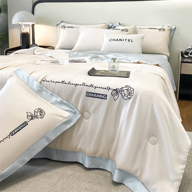 Bộ chăn ga chần hè set 4 món chất liệu phi lụa cao cấp với họa tiết thêu Charming With Love tinh xảo mang đến một chuẩn mực mới cho không gian phòng ngủ sang trọng. Bộ sưu tập sở hữu 12 tone màu pastel đắt giá, dễ phối với nhiều phong cách nội thất từ tối giản – hiện đại đến sang trọng – tinh tế, giúp căn phòng trở nên nổi bật và tràn đầy cảm xúc.