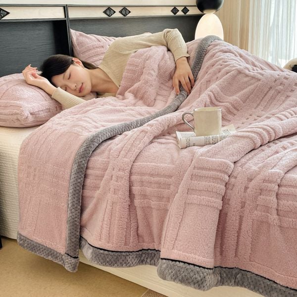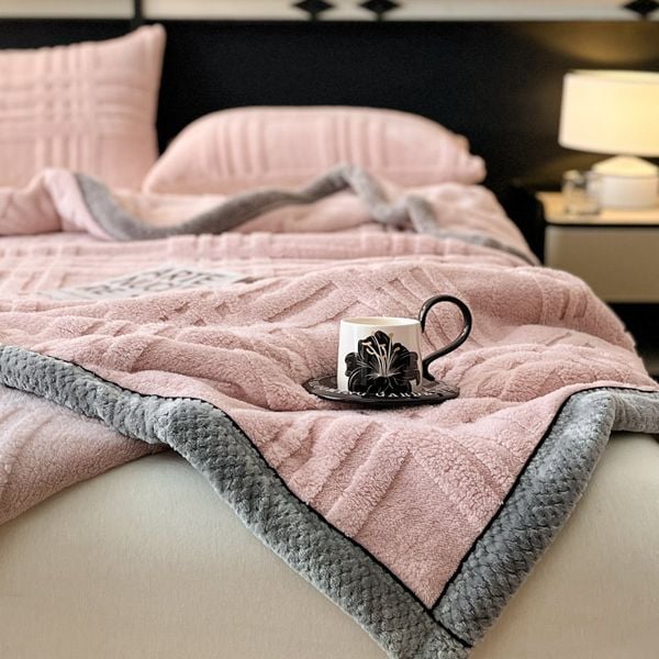 European Union Fur Wool Blanket | 3D Embossed Checkered Plus Design | 230*200cm (1.6kg) | Sweet Pastel Pink KHUYẾN MÃI - ƯU ĐÃI