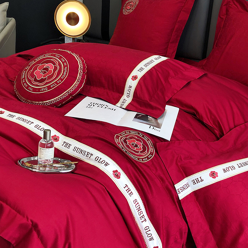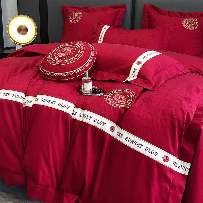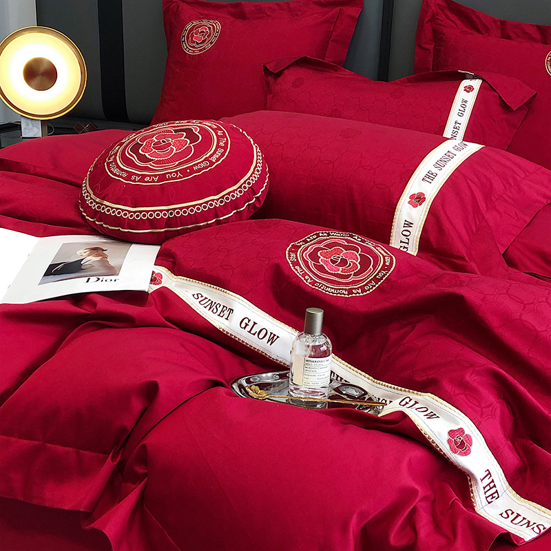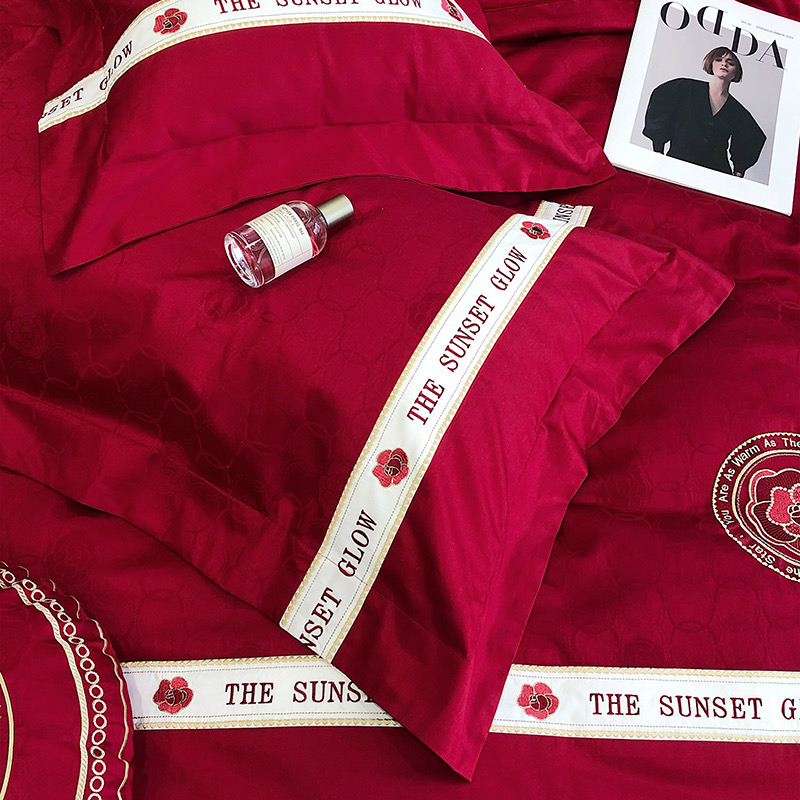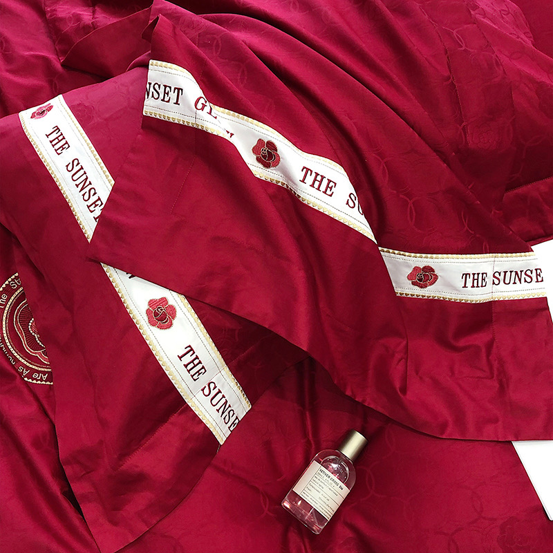 Bộ chăn ga gối 4 món thêu cao cấp Red Makeup, phong cách light luxury (tân xa xỉ), sử dụng chất liệu Lụa Ai Cập 120s sợi dài cao cấp.