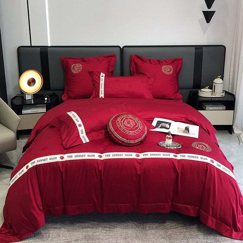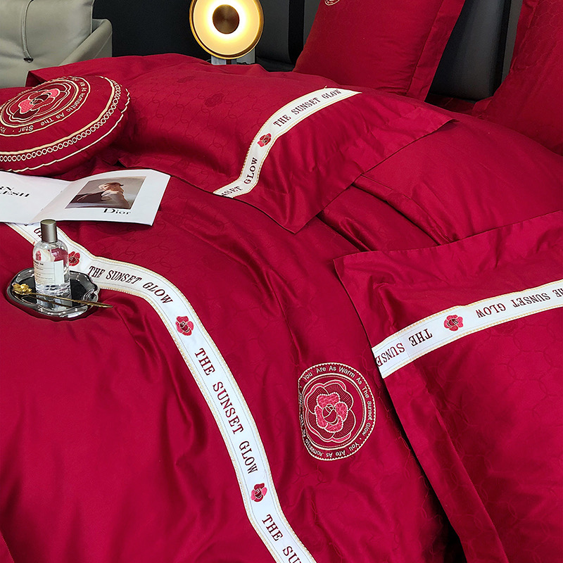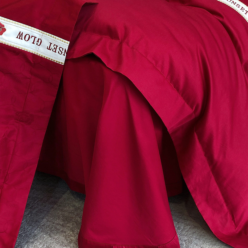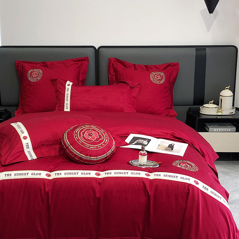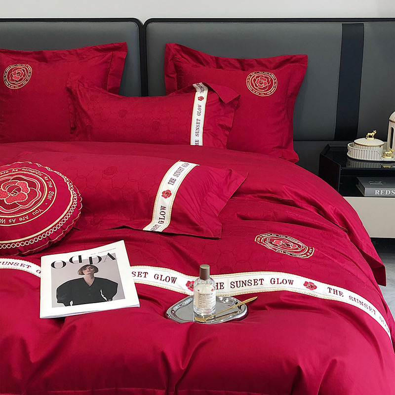 Bộ chăn ga gối 4 món thêu cao cấp Red Makeup, phong cách light luxury (tân xa xỉ), sử dụng chất liệu Lụa Ai Cập 120s sợi dài cao cấp.